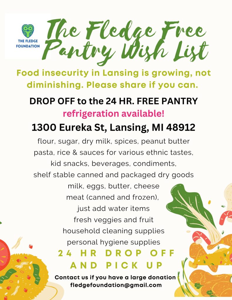 We’re holding a food drive for the Fledge Food Pantry and we need your help! Bring five canned goods or an equivalent value of other things on the wish list pictured below and earn a spin on the prize wheel!